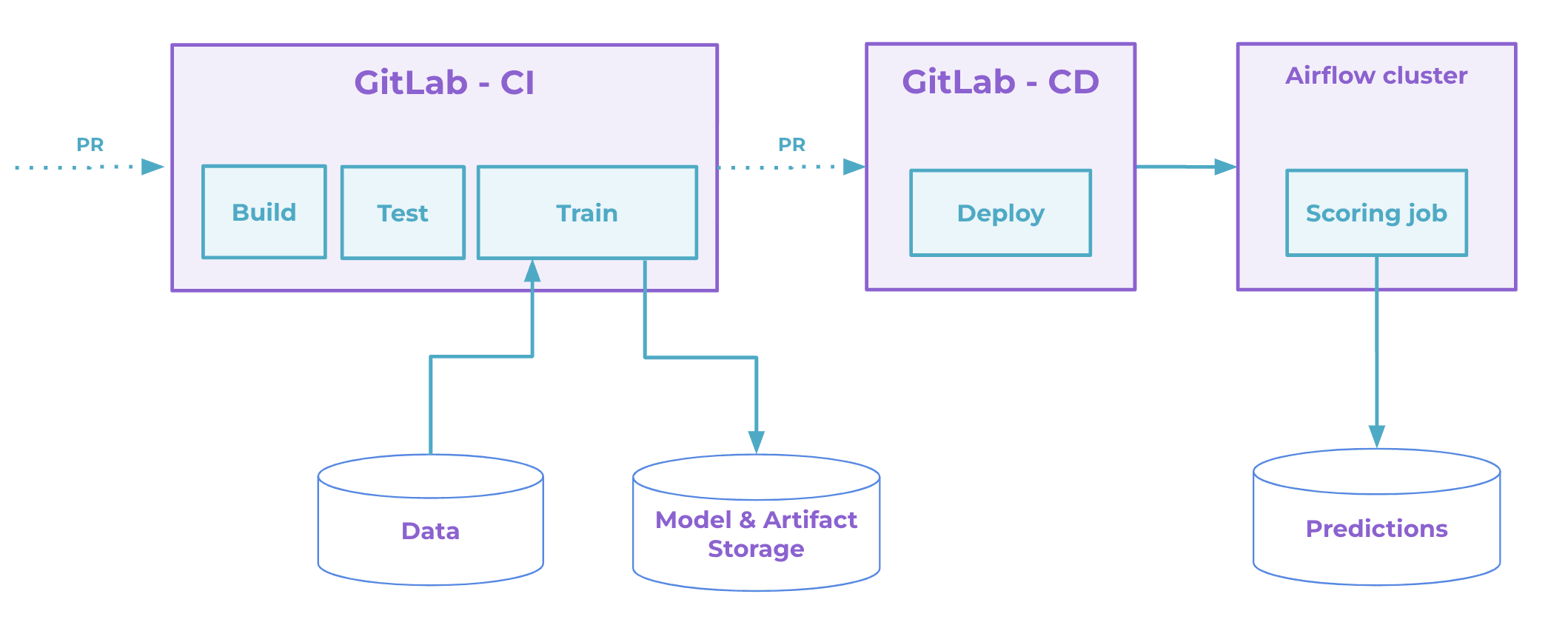 There are various strategies for delivering scoring DAG to the Airflow cluster. In this example, the GitLab CI pipeline pushes (copies) DAG files from the repo to the Airflow home directory (specified by ${AIRFLOW_HOME}) and activates it.