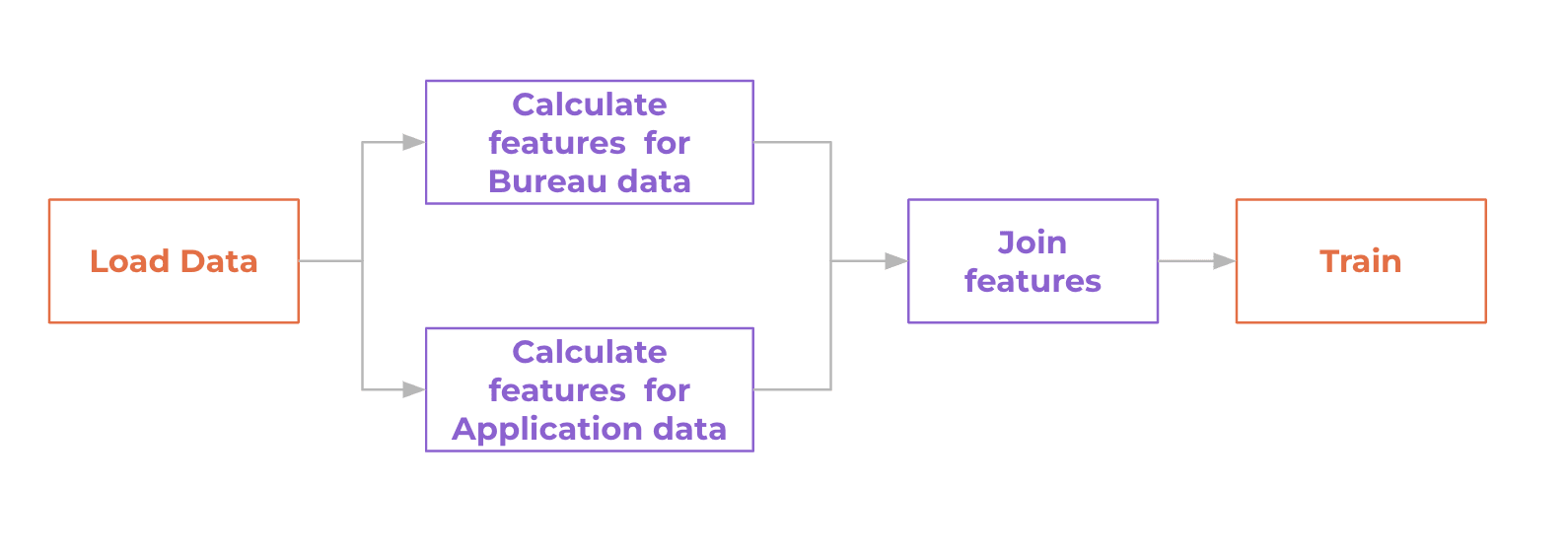 The diagram below visualizes dependencies between stages of the DVC pipeline. For such patterns, DVC helps automatically track changes and optimize the time to run the pipeline. For example, if you iteratively improve only code to calculate features for Bureau data, DVC will only rerun 3 stages: extract_features_bureau, join_features, and train. DVC with skip running load data and extract_features_application because these steps did not change, saving a substantial amount of time.