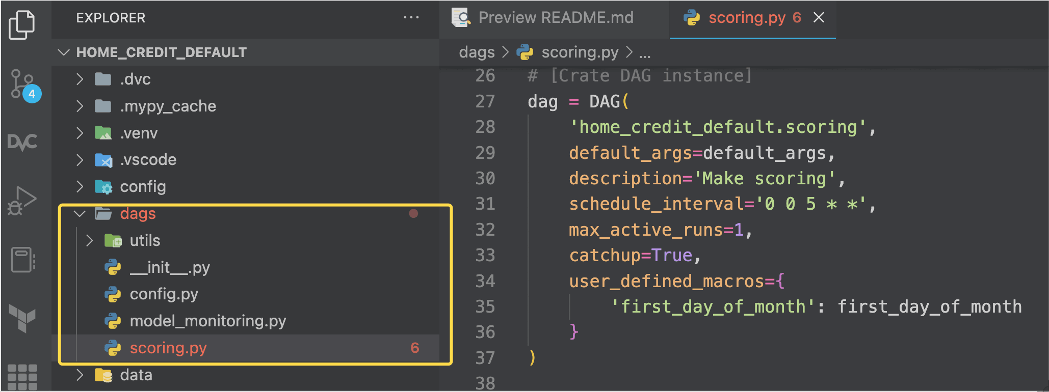 Let’s go a bit deeper into the Airflow DAG dags/scoring.py to find out how DVC is used there! This DAG is designed to be run every 5th day of the month to calculate predictions and save them into a .csv file.