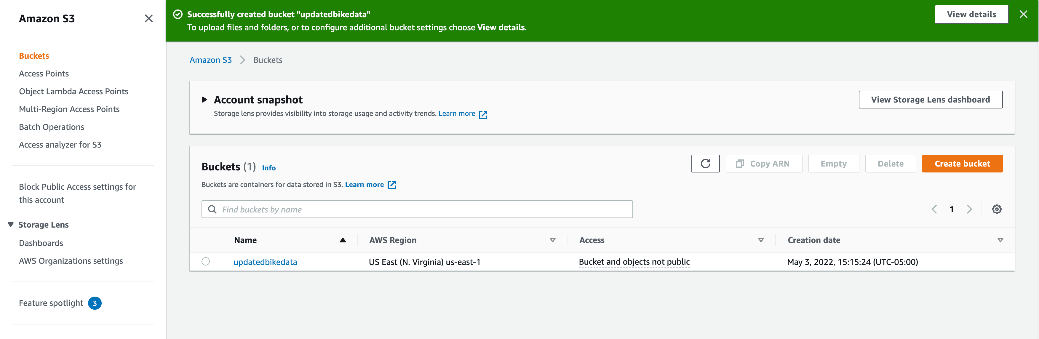 Once you’ve created the bucket, you should be redirected to the S3 dashboard and see the success message and your new bucket.