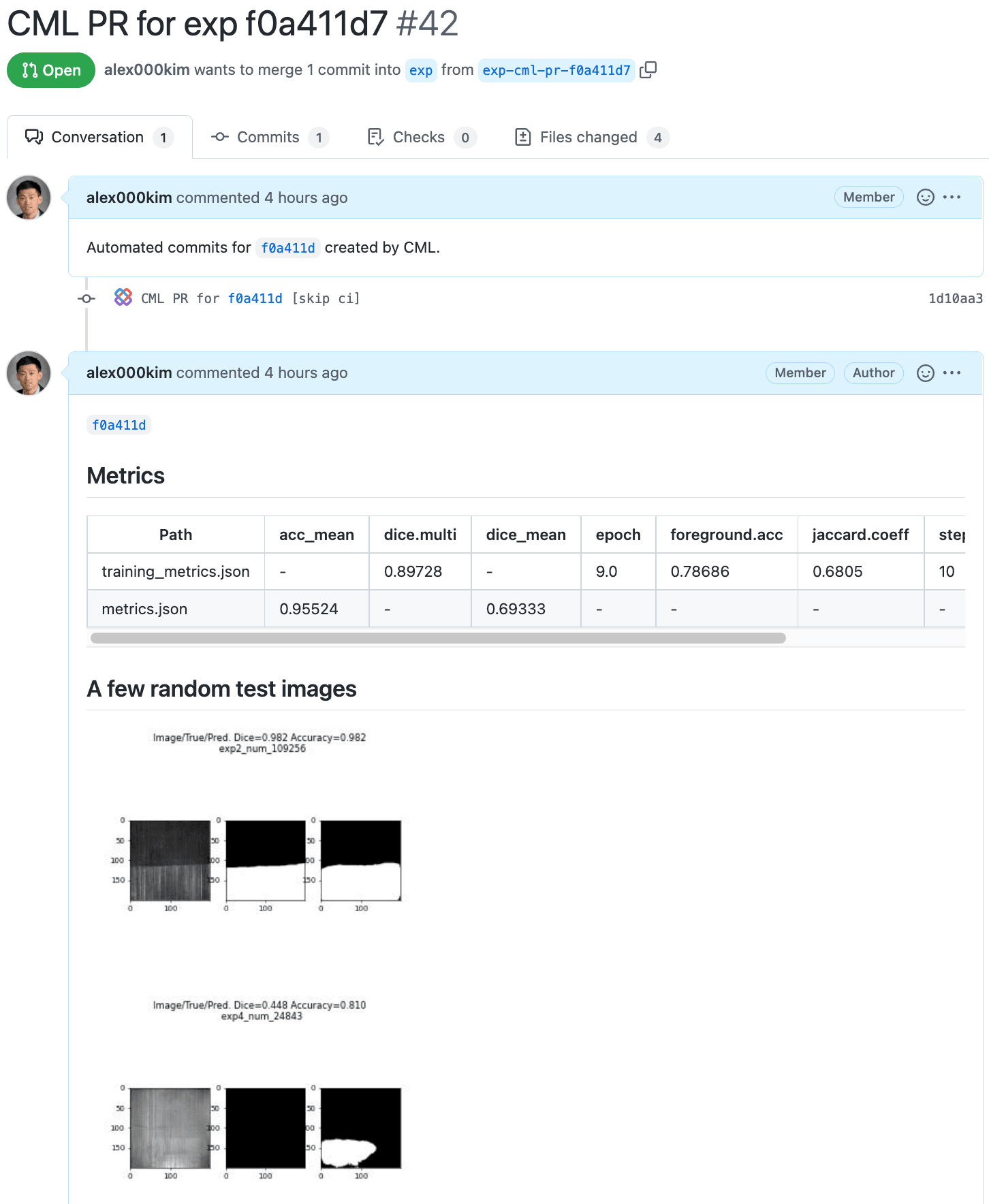 cml send-comment --pr --update report.mdThe report structure is fully customizable. Below is an example of what the PR and the CML report would look like in this case. The test images show (from left to right) input images, ground truth masks and prediction masks.