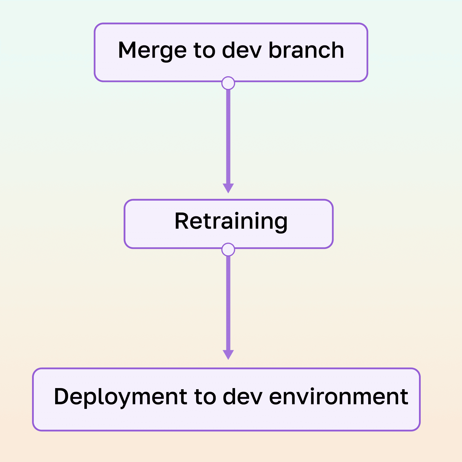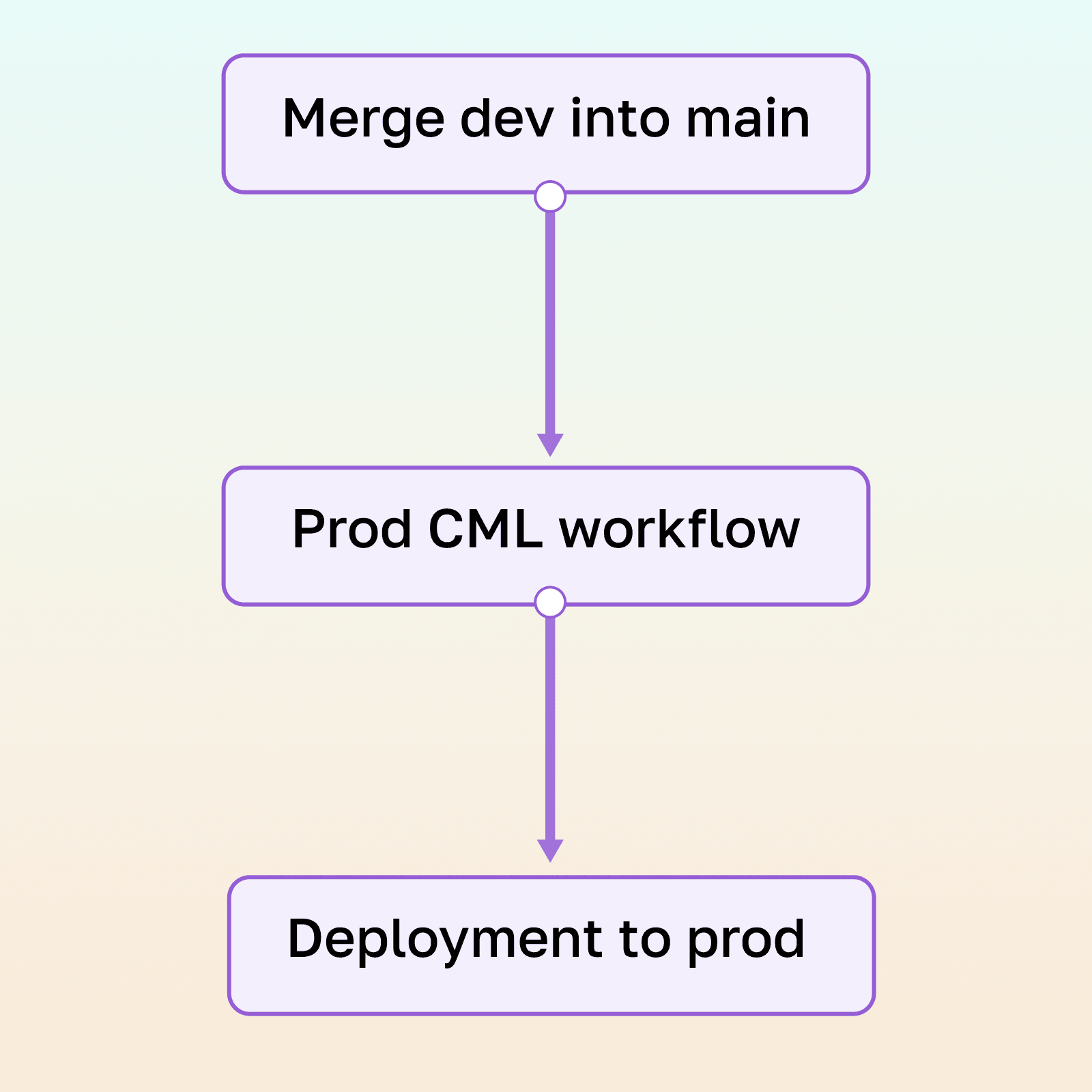 If there are no issues and we are confident in the quality of the new model, we can merge the development branch into the main branch of our repository. Again, this triggers the third CI/CD workflow that deploys the code from the main branch to the production API. This looks identical to the deployment into the development environment, except now the deployment endpoint will be