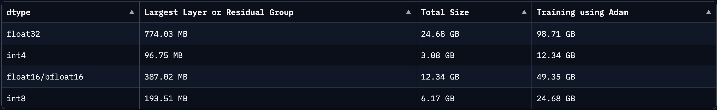 The QLoRA quantization technique will allow us to apply 4-bit quantization for model weights. For Llama 7b model, this reduces GPU memory requirements from ~98 GB (with float32 precision) down to ~12 GB (with int4 precision). The screenshot below is from a handy Model Memory Calculator that helps you calculate how much vRAM is needed to train on a model that can be found on the Hugging Face Hub.