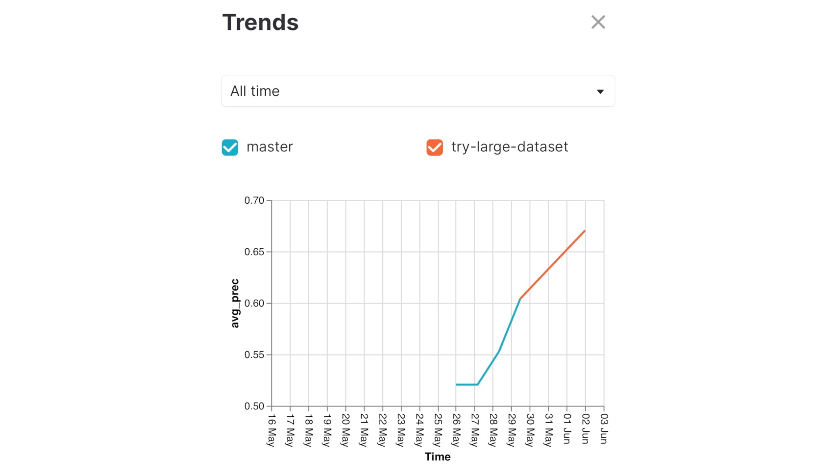 DVC, along with Git, performs your ML bookkeeping automatically. Using a simple UI, you can import your experiment history from Git. You can get quick access to important metrics across multiple projects, or dive deep and explore individual experiments. You can visualize and compare models the way that best fits your needs, whether it is through precision-recall curves, scores comparison, or trend charts showing how your model is evolving over time.
