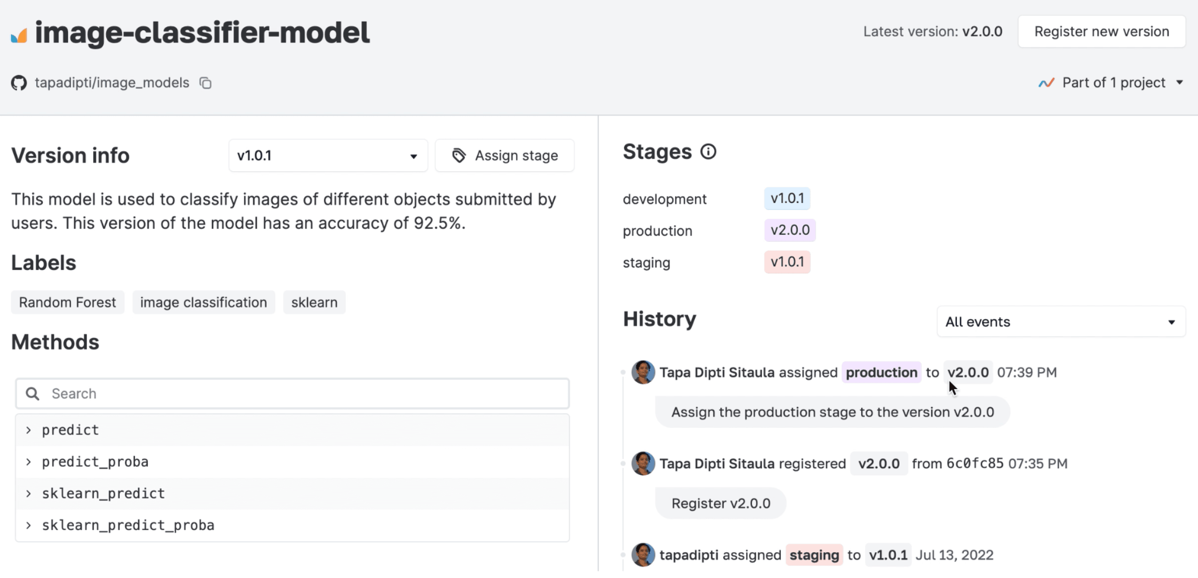 For registering versions, select the commit and provide the version number. To assign stages, select the version and provide the stage name. It is as simple as that.