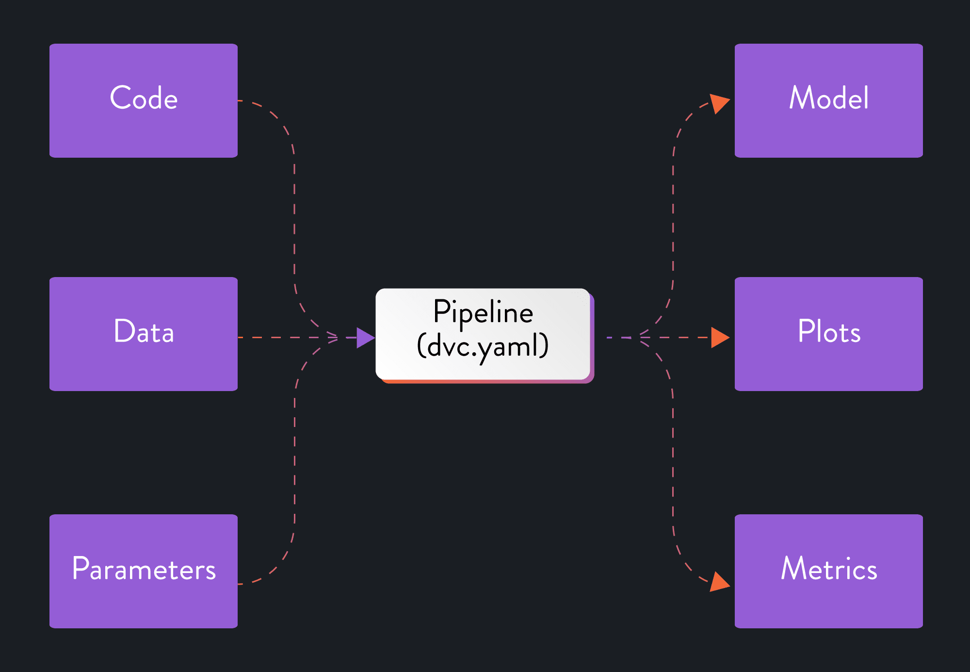 We can solve our need for reproducibility by transforming our notebook into a codified pipeline with defined inputs and outputs. This will allow us to then save every experiment that modifies the inputs, pipeline, or outputs. In this guide, we will explore how to do this using DVC. It extends Git so that in addition to code and parameters we can track and version data and models.
