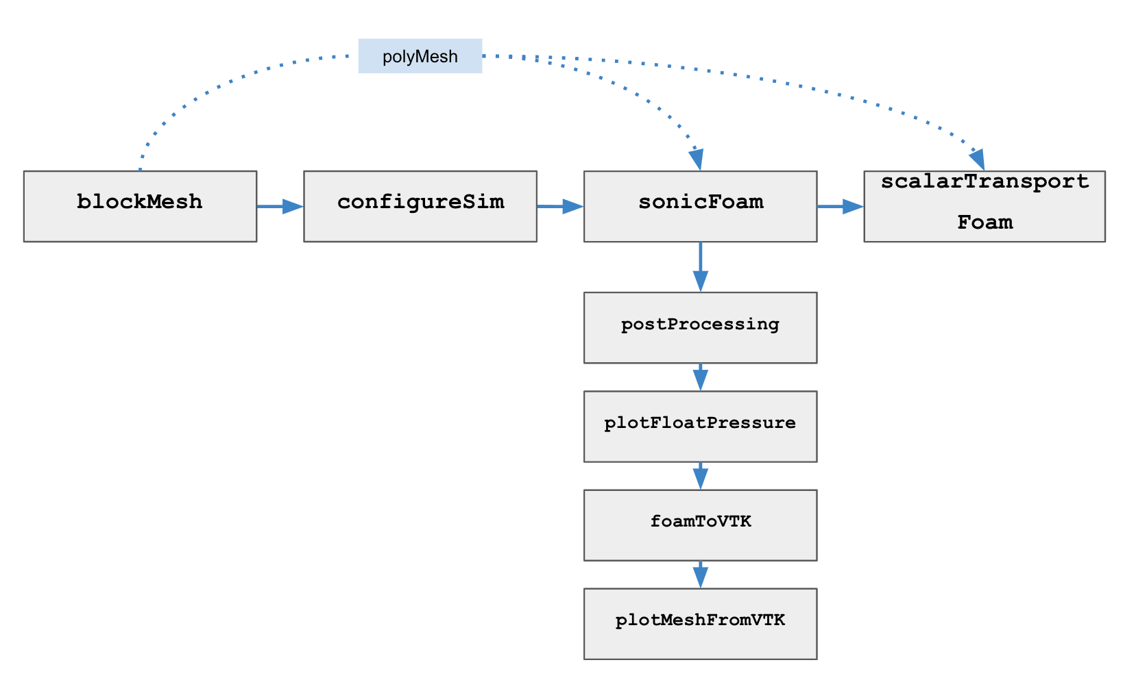 two chained simulations: sonicFoam and scalarTransportFoam.