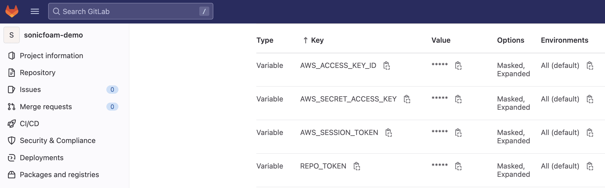 In this demo we used the following CI variables in the project