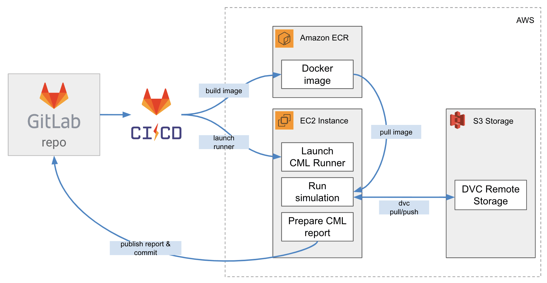 To run the demo simulation in AWS we may apply CML (Continuous Machine Learning). CML can start a new AWS EC2 instance to run a new simulation experiment and shut it down when it’s done.