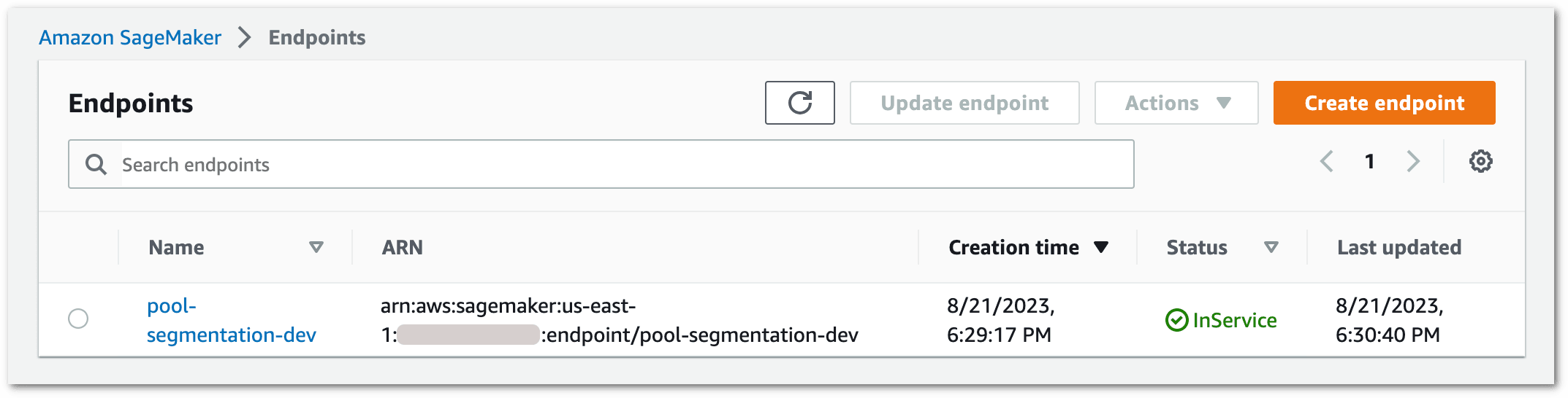 Once deployed, the endpoint status becomes InService in the AWS console.