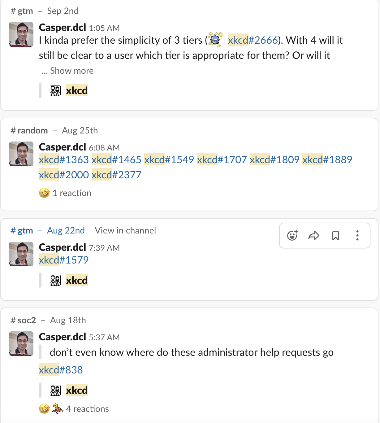 Speaking of xkcd comics, Casper da Costa Luis, CML Product Manger, loves xkcd and regularly regales us with the comics in our internal Slack. He is also an expert at TL;DRing (yes, I just made that a verb). Part of his process in this excellence is to “suppress my latent desire to add a relevant xkcd comic.” As you can see, they do not appear every day. Self-discipline is a good thing.