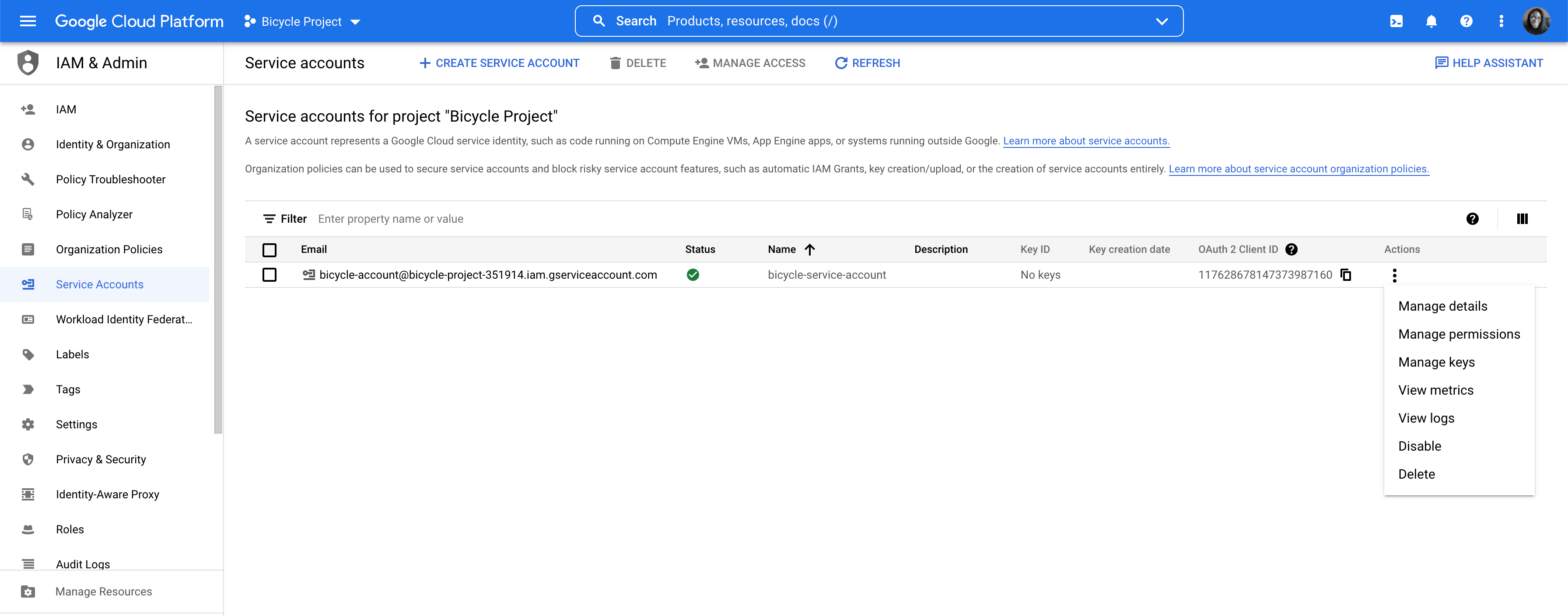 $ gcloud auth activate-service-account bicycle-service-account@tonal-history-154018.iam.gserviceaccount.com --key-file=../tonal-history-154018-e62a79baf90f.jsonIf you don't have the GCP CLI installed and you want to use the service account,