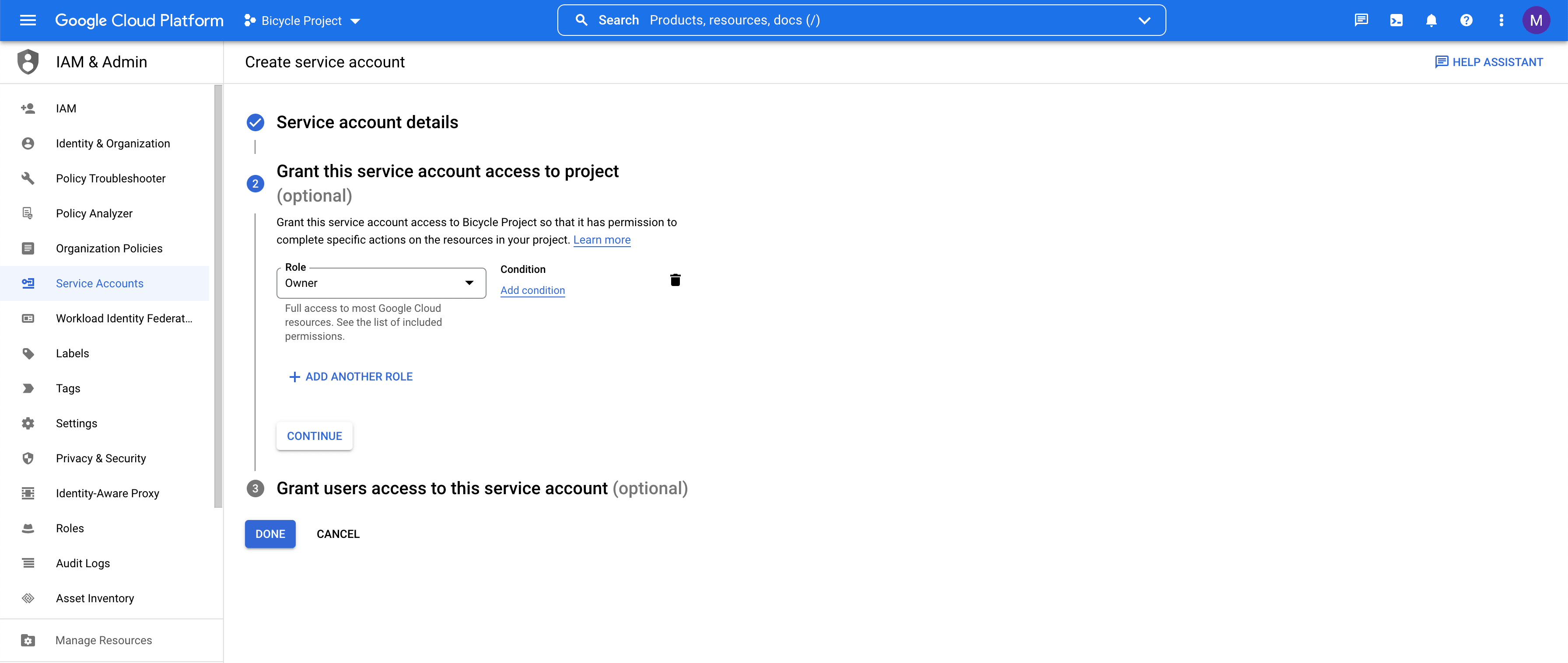 bicycle-service-account for the name and bicycle-account for the ID. Click